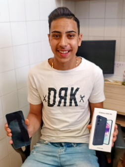 Today I was pleased to give the boy the mobile phone in the name of the Magic Lamp Foundation that he had been longing for.