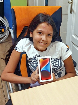 Nagy volt az öröm, amikor kibontotta a Csodalámpa Alapítvány ajándékát, és megpillantotta benne a lila színű iPhone-t.