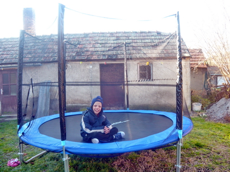A karácsonyi ünnepek után sikerült kívánságát teljesítenünk. A támogatók Budapestről érkeztek, az édesapával együtt felállítottuk a trambulint. (Levente közben a szobában játszott, semmit nem tudott arról, hogy mi készül az udvaron)