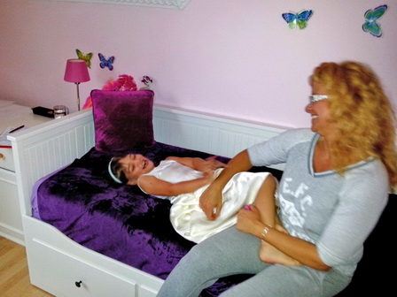Johanna már izgatottan várt bennünket, hogy megmutathassa ajándékát. Éppen a tükör előtt igazgatta királynői ruháját. Keveset beszélt és zavart örömében az anyukájába kapaszkodott miközben az új ágyán ficánkolt. Azt azonban kategorikusan kijelentette, hogy ö egy királynő.